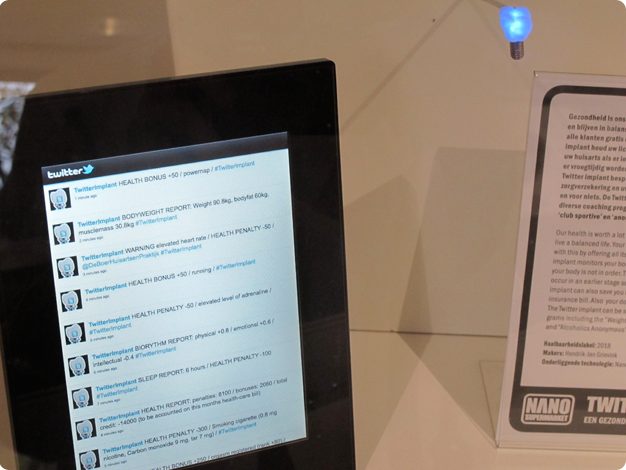 The Twitter Implant by Hendrik-Jan Grievink is monitoring device. It watches all the processes in your body and alerts your doctor when things are not in order.